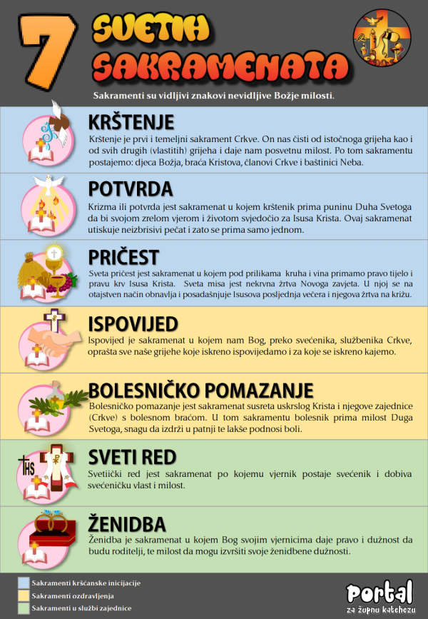 Sedam svetih sakramenata dijelimo na tri dijela: sakramenti inicijacije (krštenje, potvrda, euharistija), sakramenti ozdravljenje (ispovijed i bolesničko pomazanje) i sakramenti u službi zajednice (svećenički red i ženidba).
